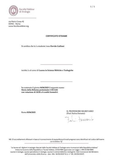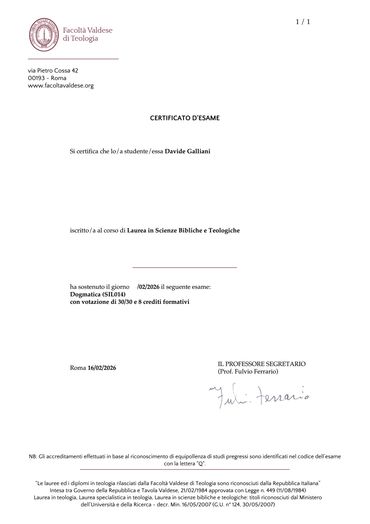 La scelta di condividere qui alcuni certificati relativi agli esami di Teologia sistematica, Dogmatica e Storia della Riforma protestante nasce dal desiderio di offrire trasparenza sul percorso formativo che sostiene questo progetto.